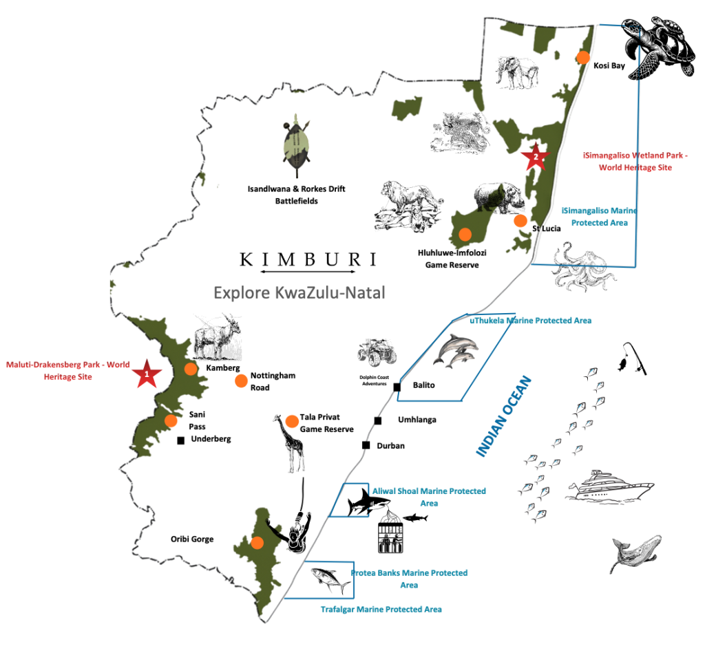 KwaZulu-Natal is one of South Africa’s most diverse and captivating provinces, where wildlife, mountains, coastline, and vibrant cities converge in a single extraordinary journey. The Kimburi Signature Tour is designed as a complete exploration of the region’s highlights — blending iconic Big 5 safari experiences, the dramatic beauty of the Drakensberg Mountains, rich cultural encounters, and the relaxed charm of KZN’s coastal lifestyle. From thrilling game drives and breathtaking mountain passes to curated city discoveries and time to unwind at the beach, this journey offers a seamless balance of adventure, scenery, and indulgence. Crafted for travellers who want to experience the very best of KZN in one unforgettable itinerary, this tour captures the essence, diversity, and spirit of the province.