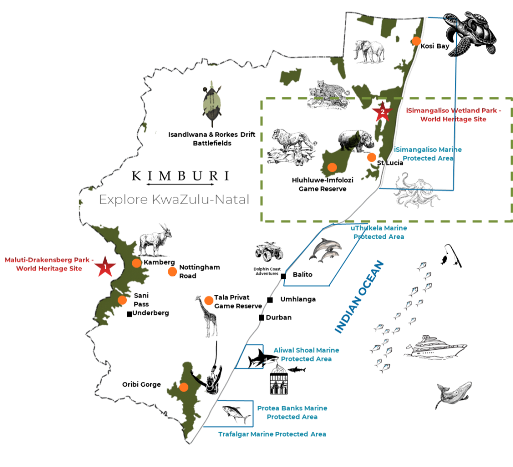 The miracle and wonder of ISimangaliso Wetland Park made it South Africa’s first world heritage site. While on a 2-hour cruise on the estuary system, there will be close encounter(s) with hippo, and possibly crocodile. The park’s birdlife is incredibly abundant and includes the African fish eagle. Lake St. Lucia is surrounded by reserves on either side – giraffe and elephant sightings on the banks are not uncommon.